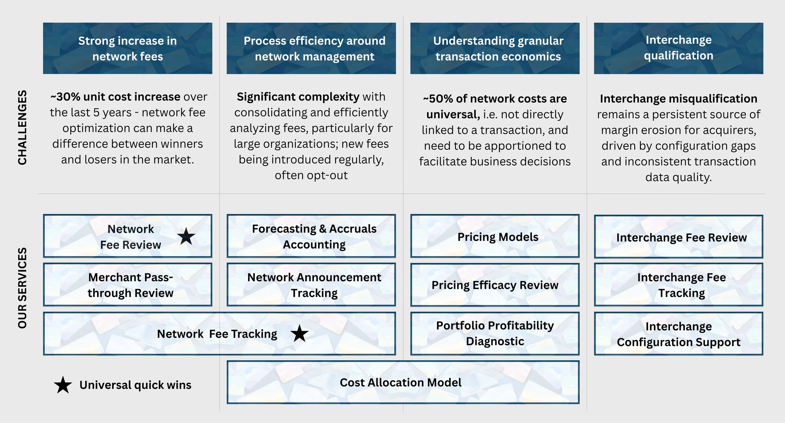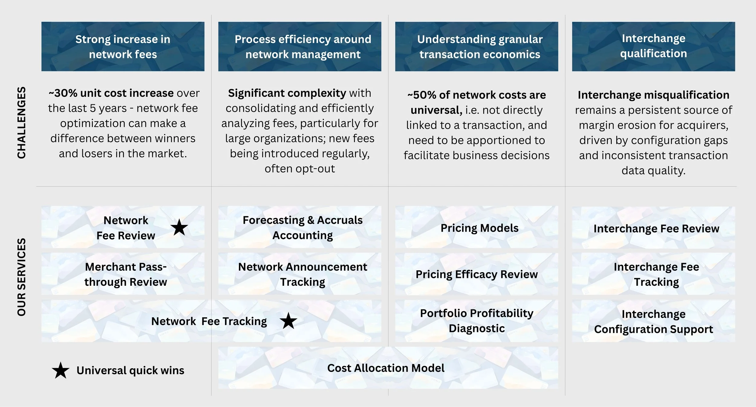 Our clients - including some of the world's leading payment card organizations - have identified network fee savings of 7-15%, reduced interchange costs by 5–10%, and improved cost recovery by up to 50%.