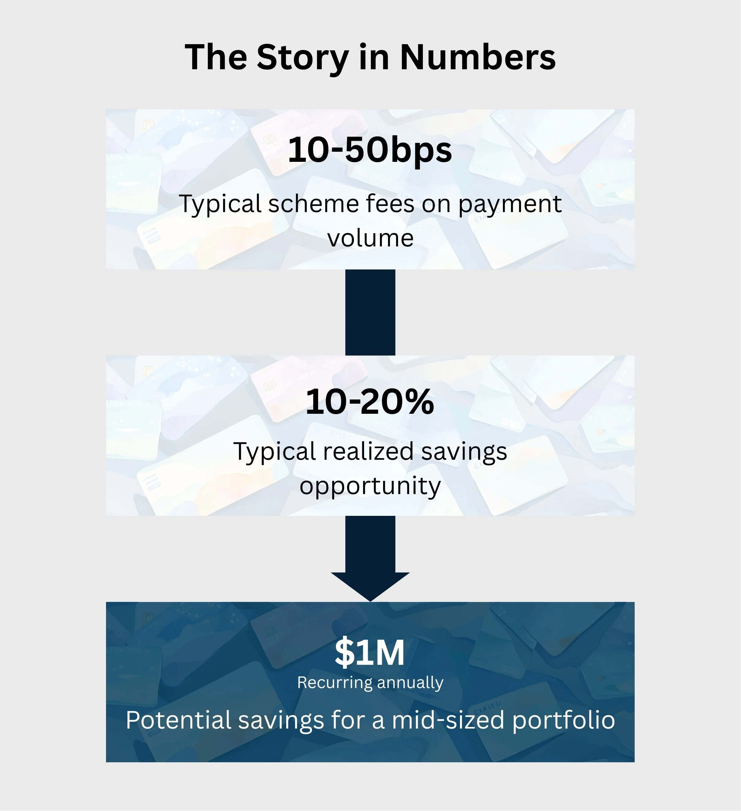 We’re saving our issuer and acquirer clients millions in scheme fees, every year.
